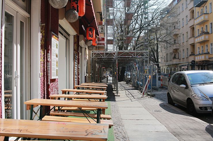Kottbusser Damm und Straße vom Hermannplatz zum Kotti zu laufen, ist meist eher eine Slalomroute. Hier Tische und Stühle vor Cafés, Restaurants, Imbissen und Spätis, Grüppchen, Kinder und Feierwütige.