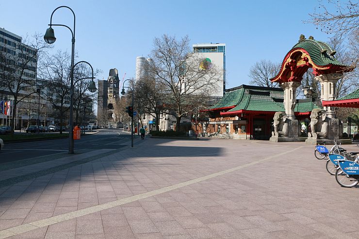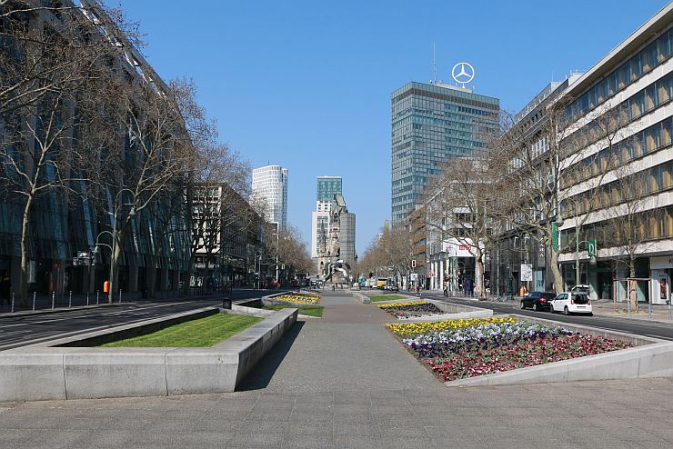 Der Blick vom Wittenbergplatz Richtung Gedächtniskirche, die Tauentzienstraße hinunter, ist immer imposant. Doch wenn man es in diesen Tagen macht, staunt man doch. Alle Geschäfte geschlossen. Kaum Flaneur*innen. Keine Tourist*innen schlendern vorüber. Was soll man hier auch? Die Schaufenster besichtigen? Teils sind sie sogar leer. Auch Taxis sind nicht zu sehen. Die Busse fahren selten.