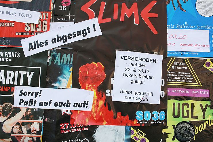 So wie alle anderen Clubs und Veranstaltungsorte hat auch das berühmte SO36 geschlossen. Die Situation für die gesamte Event- und Kulturbranche ist bedrohlich. Vieles verlagert sich ins Digitale – Inhalte lassen sich produzieren. (Dieser Blog gehört schließlich auch dazu.) Doch wie kann man die finanziellen Engpässe ohne Publikum ausgleichen, wenn alles abgesagt ist? Wenn Veranstaltungen in den Dezember verschoben werden, holt das nicht den Verlust aus den Wochen des Stillstands rein.