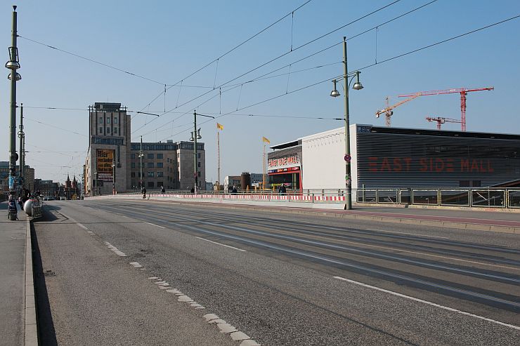 Auch dieser Ort hat mich schockiert. Die Warschauer Brücke ohne Verkehr! Ich kenne das nicht. Ich habe sie schon ziemlich oft zu unterschiedlichsten Tages- und Nachtzeiten passiert, nie war sie so leer, schließlich steigen hier täglich Tausende um. Selbst zur Zeit der Berliner Mauer war mehr Verkehr, da Mühlenstraße und Stralauer Allee eine wichtige Ausfallstrecke darstellte. Damals war die Oberbaumbrücke am Ende der Warschauer Straße ein Grenzübergang zwischen dem in Ostberlin liegenden Friedrichshain und dem West-Berliner Kreuzberg auf der anderen Seite der Spree, führte also direkt an die Mauer.