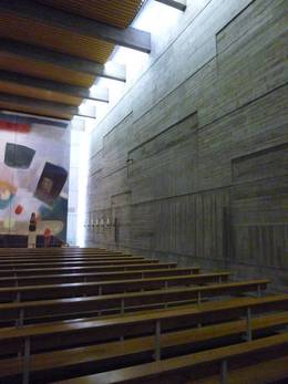 Auch der Kirchenbau selbst thematisiert die Analogie zu Gefängnissen und Lagern. Um in die Kirche zu gelangen, muss man durch einen großen kahlen Hof, von einer hohen dunklen Mauer umgeben. Die eigentliche Kirche schwebt als weißer Quader über diesem scheinbaren Gefängnishof. Rechts liegt dieser Quader auf der Hofmauer auf, links ist er wie aufgebockt auf zwei kurzen Wandscheiben. Zwischen diesen Wandscheiben führt eine mühsame Betontreppe hoch. Und dann ist man da – in einem weiten Raum, im Kirchenschiff, in dem man sowohl die Weite des Raums - als auch wieder das Hermetische von nackten Betonwänden spürt. Und Licht. Nein – keine Fenster. Aber rechts und links gleitet indirekt geführtes natürliches Licht an den rohen Betonwänden ins Innere und macht diese Betonwände zum bestimmenden Element der Kirche. Material pur. Vieles in dieser Kirche ist aus Beton – dieses toughe Material wird durch feinsinnig variierte Oberflächen zugleich auch empfindsam.